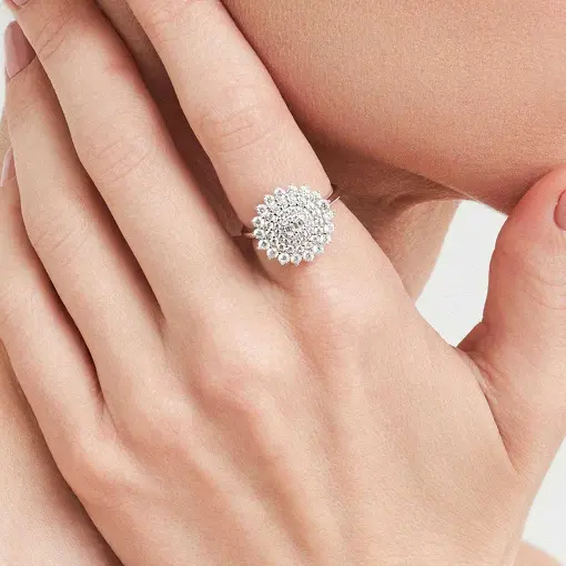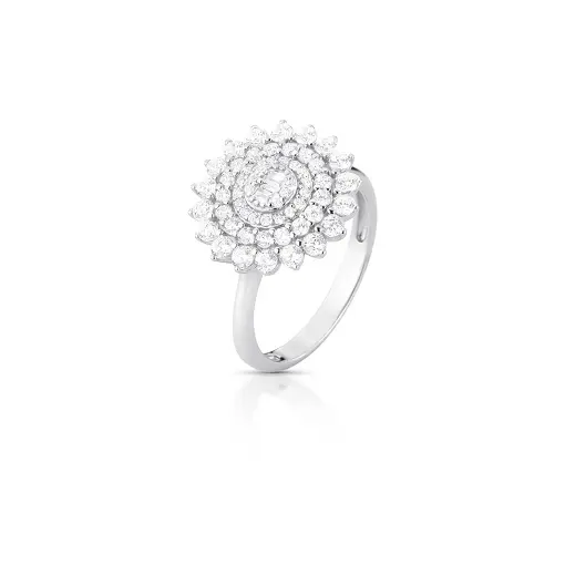 ANEL REDONDO DE FLOR COM CRISTAIS E ZIRCÔNIAS PRATA RODINADA