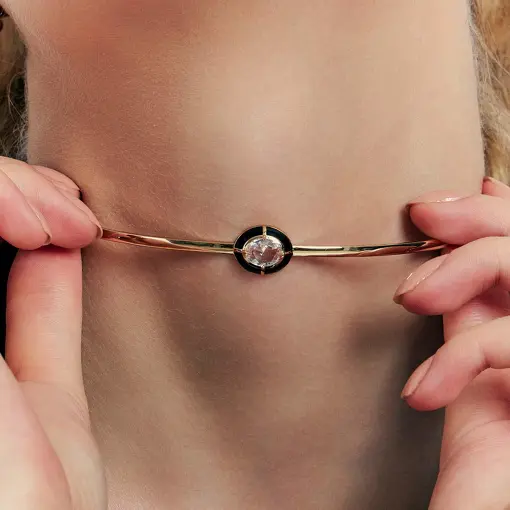 GARGANTILHA COM CRISTAL OVAL E ESMALTADO BANHADO A OURO