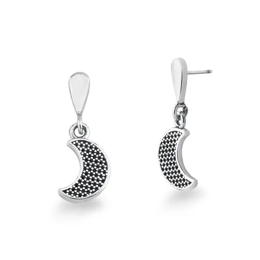 BRINCO PÊNDULO COM LUA VAZADA E LISA EM PRATA ENVELHECIDA